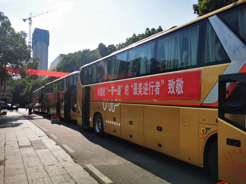 出征儀式上,湖南交水建集團領導向赴格團組領隊授 " 赴格魯吉亞復工復產先鋒隊 " 隊旗,省國資委、湖南交水建集團和湖南路橋集團相關領導對團組成員進行慰問,贈送防疫愛心禮包,歡送這群為國際工程履約、奔赴海外的 " 最美逆行者 "。
